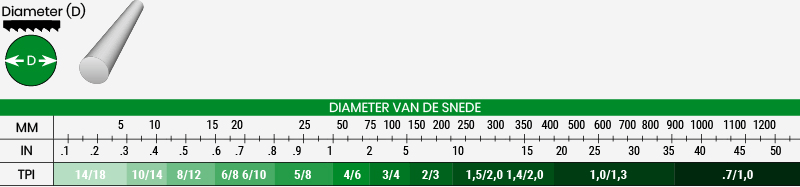 - De juiste vertanding vind je onder de afmetingen van het materiaal in de kolom TPI